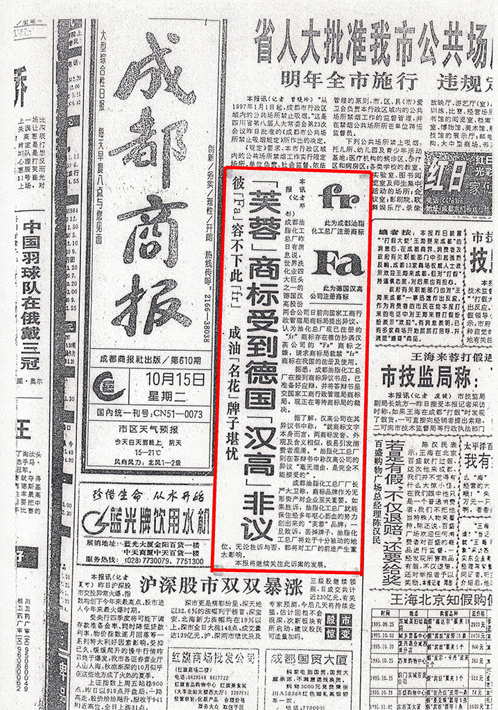 1996年10月15日,德国汉高股份有限公司及两合公司(HenKeL AG & CO.KGaA)向国家商标局提出成都油脂日化总厂“芙蓉”品牌“fr”商标异议,请求国家商标局裁禁“fr”商标注册和使用。《成都商报》以标题为:《‘芙蓉’商标受到德国‘汉高’非议——彼“Fa”容不下此“fr” 成油“名花”牌子堪忧》做过新闻报道,报道时间:1996年10月15日 星期二 第一版 成都商报第610期