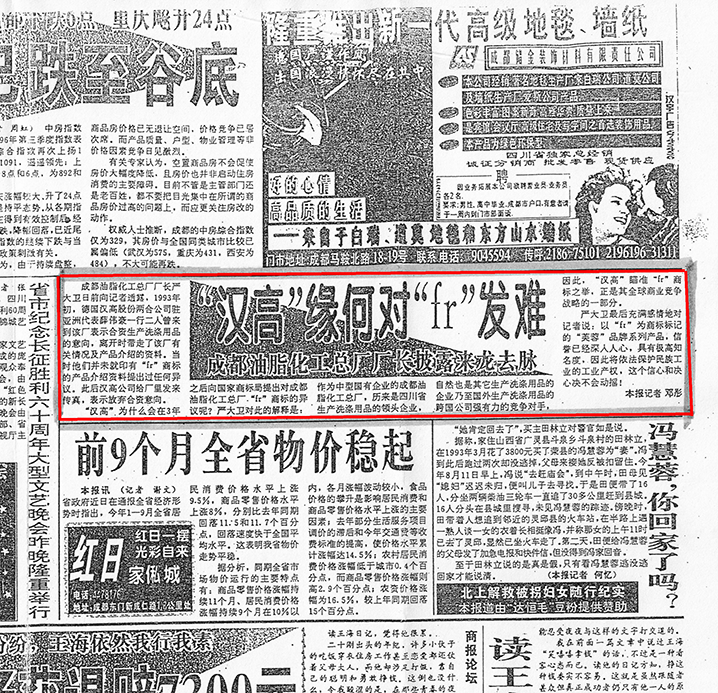 1996年10月22日,《成都商报》以标题为:《‘汉高’缘何对‘fr’ 发难——成都油脂化工总厂厂长披露来龙去脉》进行了系列跟踪报道。 报道时间:1996年10月22日 星期二 第一版 成都商报 第617期