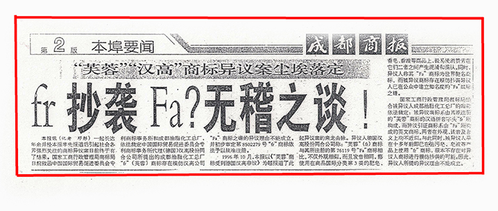 1996年10月16日,《成都商报》以标题为:《‘Fa’和‘fr’ 商标相同吗》进行了跟踪报道:报道时间:1996年10月16日 星期三 第一版 成都商报第611期
