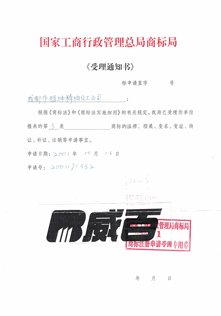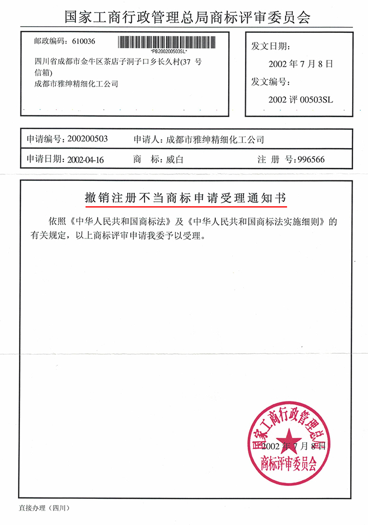 2001年10月15日、2002年4月16日 成都雅绅公司向国家商标评审委员会提出撤销德国汉高股份有限公司(HenKeL AG & CO.KGaA)在后注册的系列“威白”商标的“撤销注册不当商标” 申请《撤销注册不当商标受理通知书》发文编号:20014749SL;2002评00503SL;……。