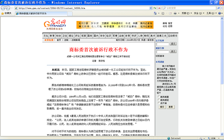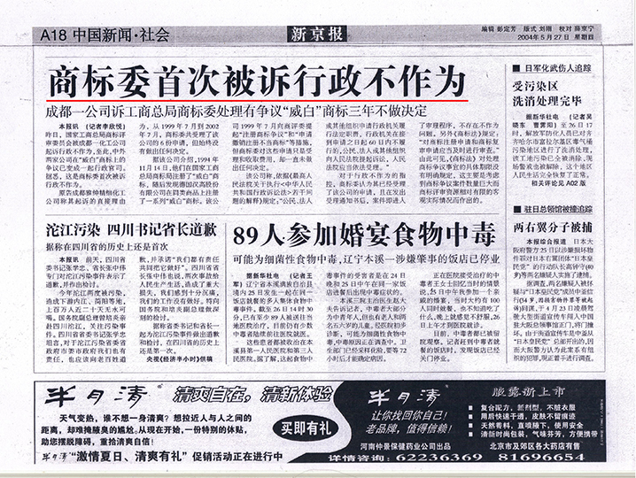 由于长年的得不到商标评审委员会的裁定,成都民营企业成为了全国首例状告商标评审委员会行政不作为的企业。 新闻报道见下图: