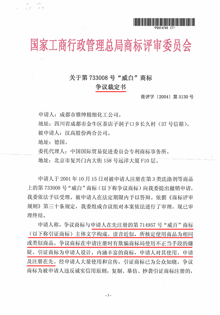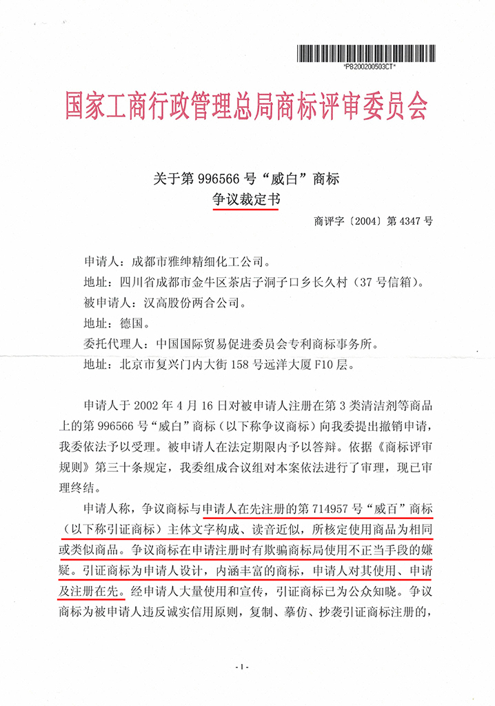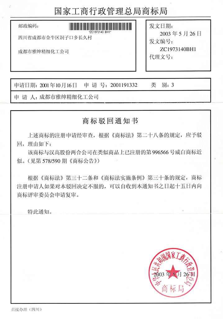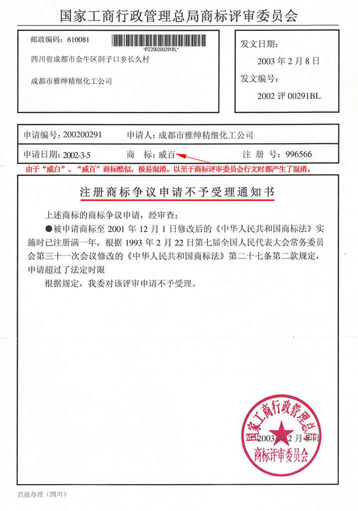 2003年5月26日成都雅绅公司获得商标局“威白”、“威百”商标是近似商标的认定。发文编号:ZC1973140BH1