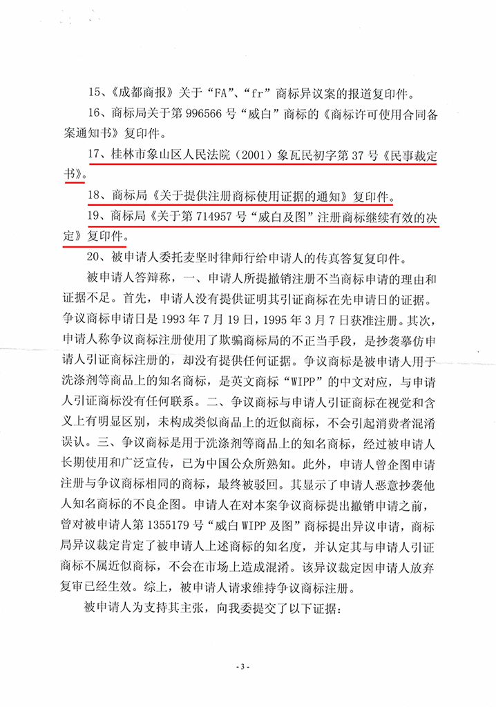 再多说一点,商标评审委员会的《关于第733008号“威白”商标争议裁定书》、《关于第996566号“威白”商标争议裁定书》中‘18、商标局《关于提供注册商标使用证据的通知》复印件。19、商标局《关于第714957号“威百及图”注册商标继续有效的决定书》复印件。’P3又是怎么一回事呢?