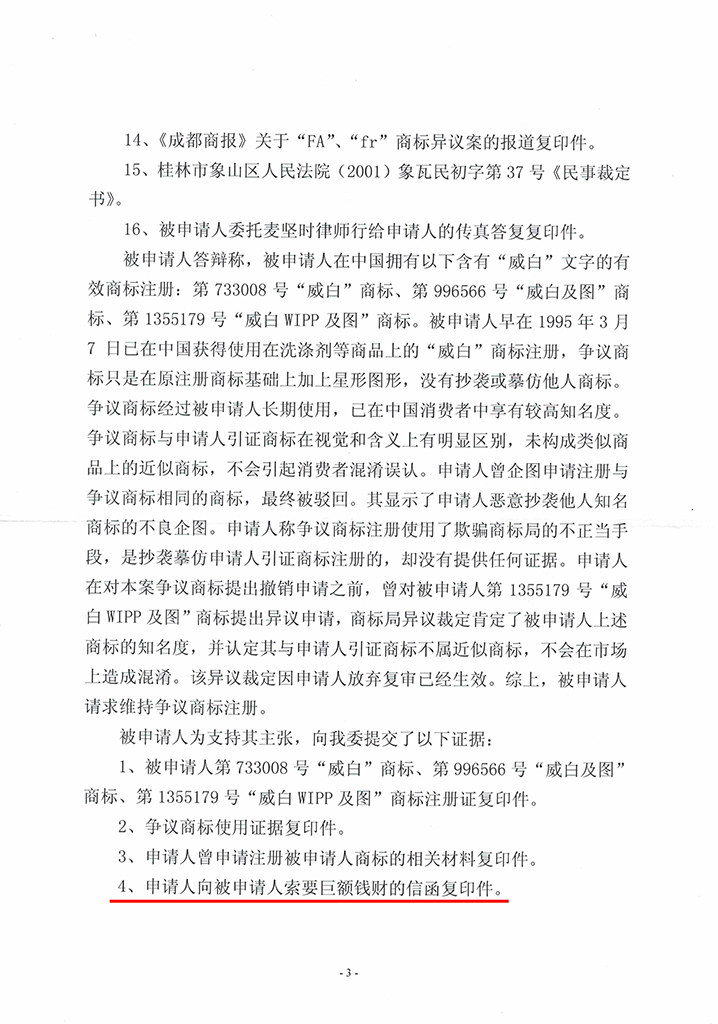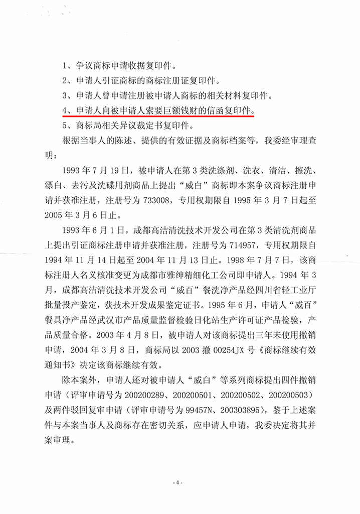 任何单位或者个人认为商标注册不当的,可以将《撤销注册不当商标申请书》一式两份交送商标评审委员会申请裁定。商标评审委员会做出终局裁定,书面通知有关当事人,并移交商标局办理。】以及全国人民代表大会常务委员会《商标法》第四十一条释义,(依据《立法法》第四十五条法律解释权属于全国人民代表大会常务委员会。法律有以下情况之一的,由全国人民代表大会常务委员会解释:(一)法律的规定需要进一步明确具体含义的; 第五十条 全国人民代表大会常务委员会的法律解释同法律具有同等效力。)依法商标评审委员会应该作出撤销被申请人在后的“威白”注册商标。由于作出的“商标争议裁定书”,成都民营企业是会向人民法院提起诉讼,商标评审委员会在“商标争议裁定书”中做了特殊措辞的处理。其裁定书的内容产生了特殊的引导作用。如:‘引证商标为申请人设计,内涵丰富的商标,申请人对其使用、申请及注册在先。经申请人大量使用和宣传,引证商标已为公众知晓’。 见《关于第733008号“威白”商标争议裁定书》、《关于第996566号“威白”商标争议裁定书》P1 仅简单一笔带过,其中引证商标的丰富内涵成都民营企业就已经阐述了“威百”商标含义包含了“威白”商标。其内容多达2千多字,商标评审委员会对此只字不提。仅一句‘内涵丰富的商标,’一语带过。而被申请人在《撤销注册不当商标答辩书》中,对成都民营企业的“威百”商标,“威百”二字的组合,不是中国汉语中的常见表现形式,在汉语中并非固定搭配。是成都民营企业自行构思、设计、组合,具有绝对的原创性、首创性、独创性的商标,是知道的。被申请人使用“威白”二字作为商标注册,在被申请人的《撤销注册不当商标答辩书》中以及相关的法庭庭审中均没有且无法说明其设计理念,构思、含义等及未能合理说明其商标设计的由来。“威白”二字组合显然不是中国汉语中的常见表现形式,在汉语中并非固定搭配。至今被申请人都未能对使用“威白”二字作为商标做是被申请人自己原创设计的陈述。被申请人对“威白”商标的来源在《撤销注册不当商标答辩书》中答辩为“威白”二字是被申请人的第1297685号“WIPP”英文商标的对应商标。是对第1297685号“WIPP”商标的音译。这种答辩耐人寻味。首先,被申请人的第一个第733008号“威白”商标,商标的注册时间是:1995年3月7日;而被申请人的英文“WIPP”第1297685号商标的注册时间是1999年7月28日,也就是说被申请人的第733008号“威白”中文商标的注册时间先于被申请人的第1297685号“WIPP”英文商标四年多,怎么能说一个早就在先四年多就注册了的中文商标是在后英文商标的中文对应?是在后英文商标的中文音译?即使是对应商标,那也是被申请人的第1297685号“WIPP”英文商标是第733008号“威白”中文商标的对应商标。完全是在注册了中文“威白”商标后,由于成都民营企业一直在设法保护自身的“威百”商标合法权益并已经告知被申请人“威白”商标已经对原告的“威百”商标构成侵权之后,被申请人才到商标局去注册第1297685号“WIPP”英文商标。这些事实,商标评审委员会是完全知道的,是非常清楚的。“威白”、“威百”商标是字形酷似、读音相同、含义相同,“威百”商标含义包含了“威白”商标,再加上商标局对“威白”、“威百”商标是近似商标的认定。商标评审委员会依法只能作出撤销被申请人的“威白”注册商标裁定,对此,商标评审委员会简单一笔带过。然而,却故意借用答辩人之口:‘4、申请人向被申请人索要巨额钱财的信函复印件。’见《关于第733008号“威白”商标争议裁定书》、《关于第996566号“威白”商标争议裁定书》P4、P3 断章取义进行歪曲事实。此举,对于商标评审委员会来说,没有毛病,因为是摘录答辩人的答辩词,商标评审委员会是不会承担任何法律责任的。而答辩人说这种话,也情有可原,答辩是委托代理人写的,拿人钱财,替人消灾,各为其主,在答辩中进行诡辩也是情理中的事情。是敬业精神的表现。而事实上呢?所谓的:‘申请人向被申请人索要巨额钱财’只是答辩人的诡辩歪曲事实的说法而已,事实上是:2001年,成都民营企业在桂林市象山区人民法院提起了对被申请人的商标侵权的诉讼。见商标评审委员会《关于第733008号“威白”商标争议裁定书》、《关于第996566号“威白”商标争议裁定书》P3 ‘15、17、桂林市象山区人民法院(2001)象瓦民初字第37号《民事裁定书》。’庭审时被申请人当庭提出庭外和解。被申请人代理律师告诉成都民营企业:‘汉高公司有意购买你们的商标。请报个价过去。’当年,政府并没有开展反腐败工作,面对有强大经济实力、公关实力的被告。原告成都民营企业非常的为难。出让和不出让商标,对成都民营企业都是不利的。出让商标,意味着失去品牌、失去市场。但如果不出让商标,被告强大公关力量的结果其实就是今天的在后所有成都民营企业提起的商标侵权诉讼都是败诉。当时成都民营企业就已经意识到了这个问题。因此,为了挽回一些损失,成都民营企业无奈的通过函件向被告委托律师做了商标报价:‘张玉林先生:您好!就我公司诉桂林市汉高洗涤剂有限公司商标侵权一案,现应对方提议进行庭外和解,我公司同意庭外和解,现就和解提出