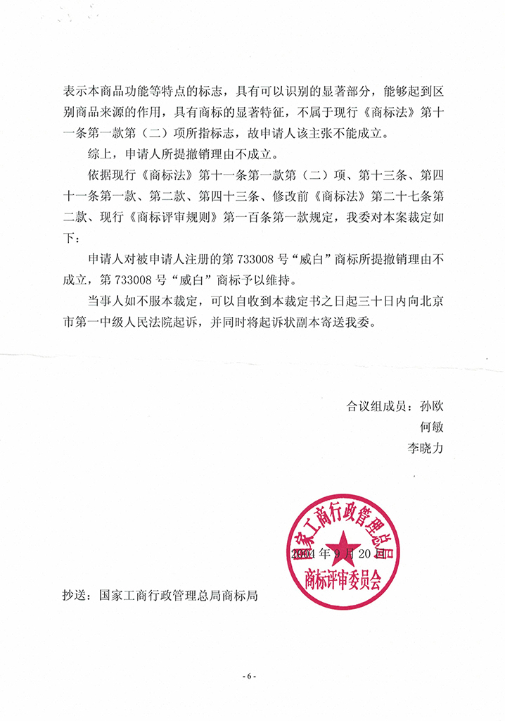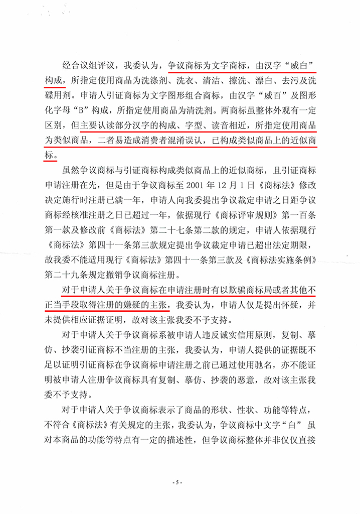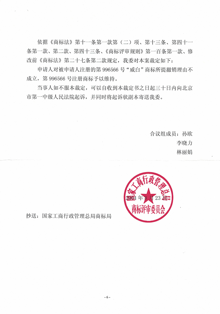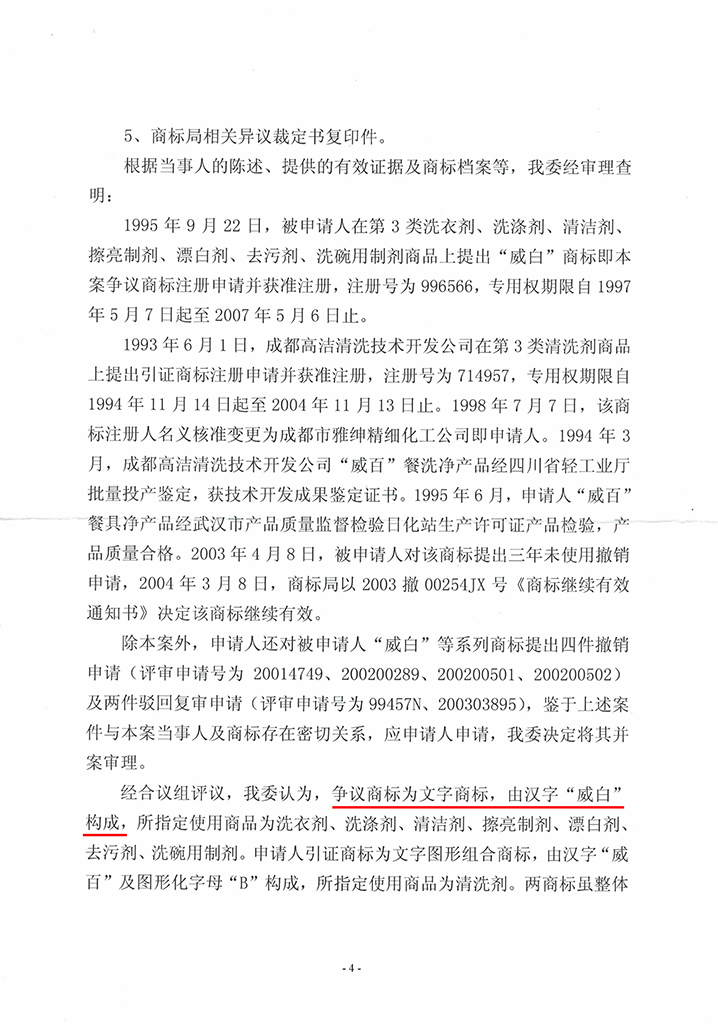 此后,于2004年商标评审委员会作出了《关于第733008号“威白”商标争议裁定书》、《关于第996566号“威白”商标争议裁定书》,同时,该裁定书再次明确认定:“威百”、“威白”商标是‘争议商标为文字商标,由汉字“威白”构成,…… 主要认读部分汉字的构成、字形、读音相近,所指定使用商品为类似商品,二者易造成消费者混淆误认,已构成类似商品上的近似商标。 ’。 见下图: