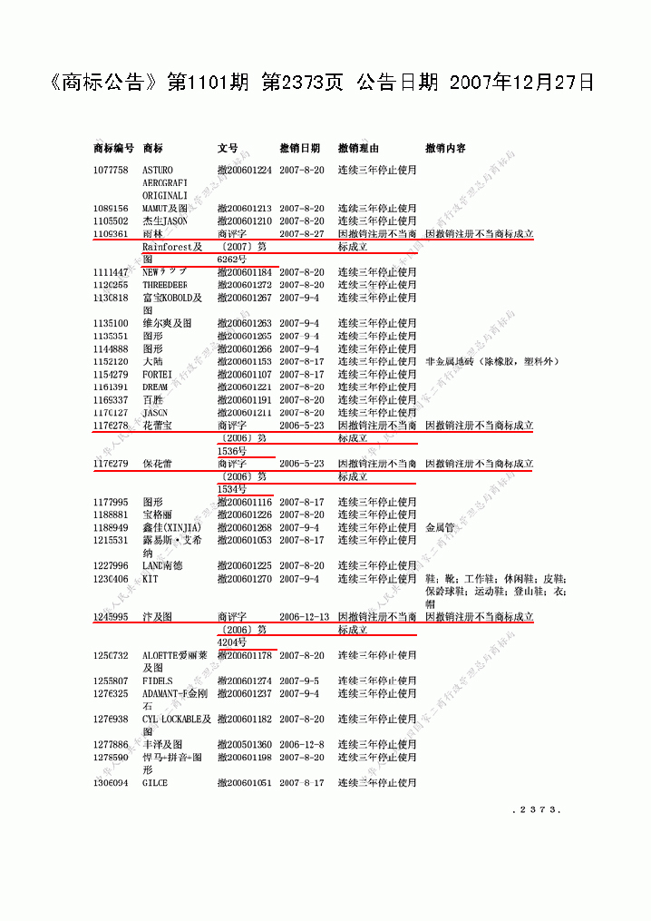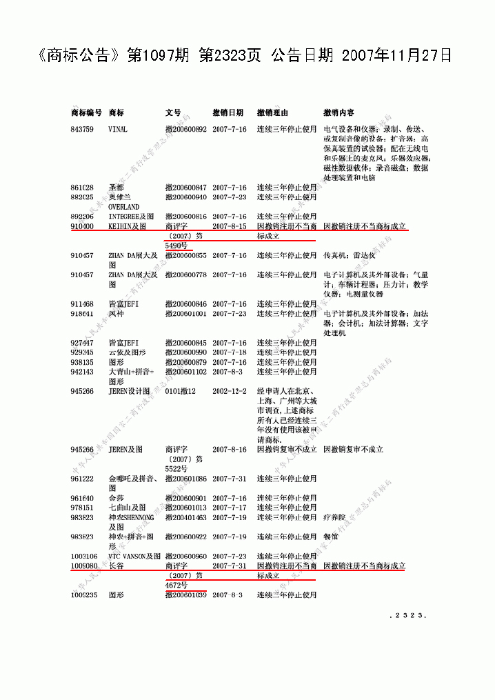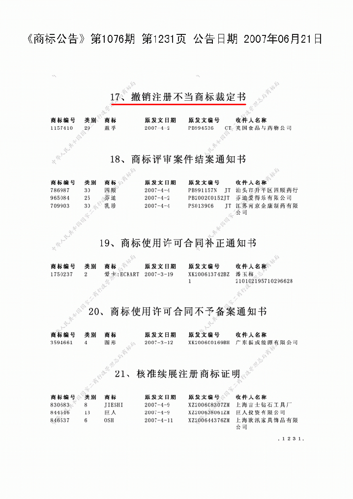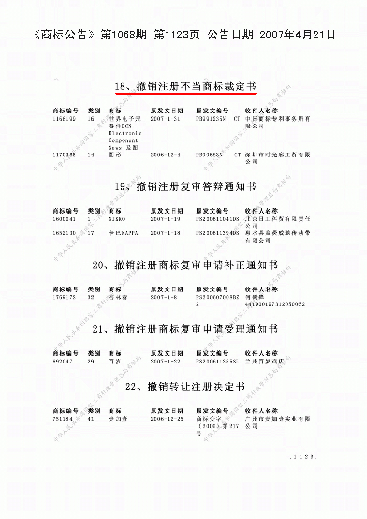 对于“撤销注册不当商标”案件,商标评审委员会作出的“裁定书”应该是《撤销注册不当商标裁定书》见《商标公告》见下图: