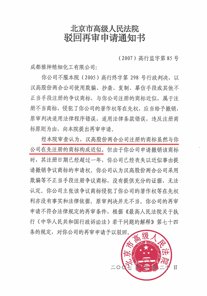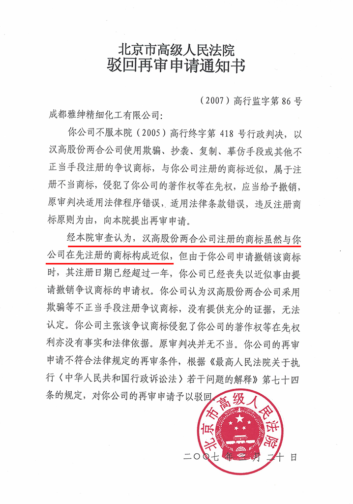 2007年2月20日北京市高级人民法院《北京市高级人民法院驳回再审申请通知书》第85号、第86号成都雅绅公司再次获得北京市高级人民法院对“威白”、“威百”商标的近似商标认定。