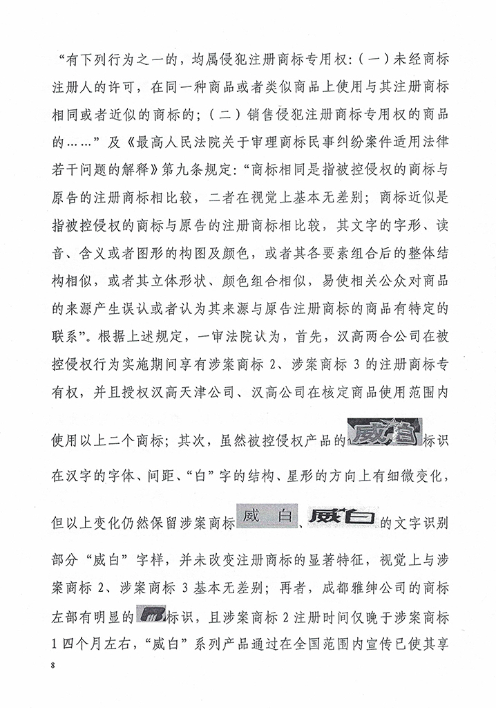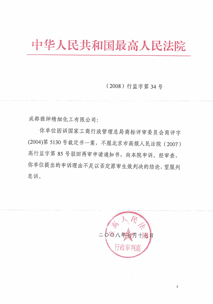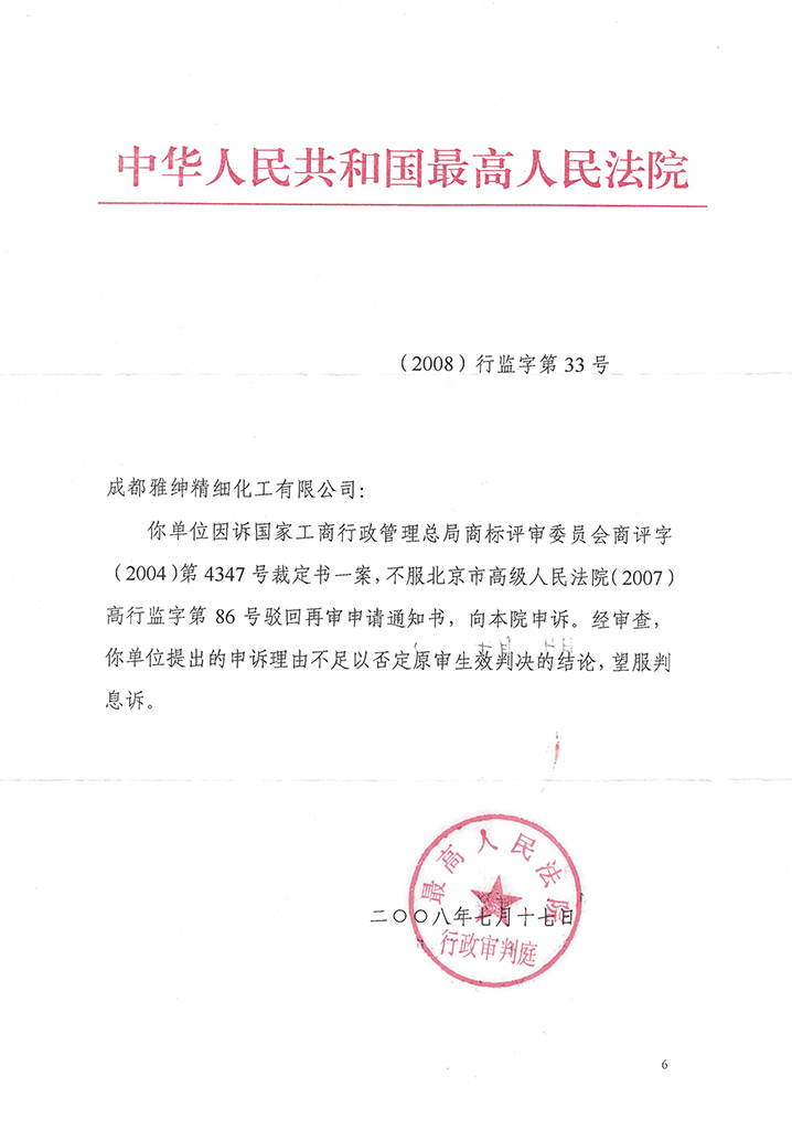 2008年7月17日中华人民共和国最高人民法院(2008)行监字第33号、第34号,成都雅绅公司再次获得中华人民共和国最高人民法院对“威白”、“威百”商标的近似商标认定。