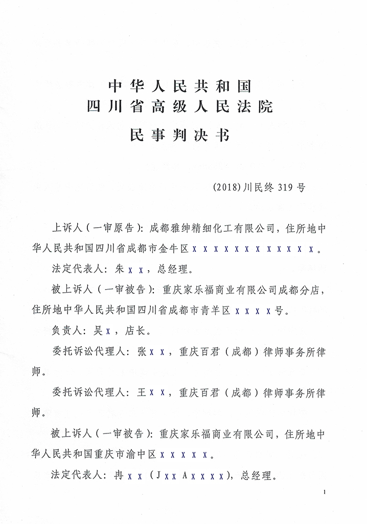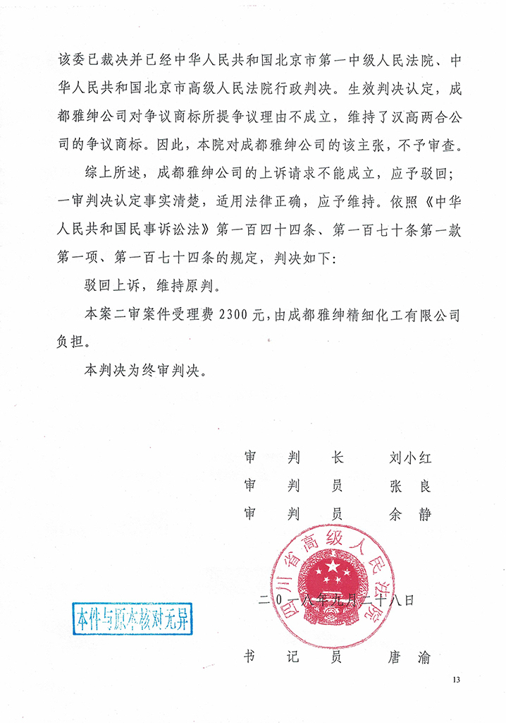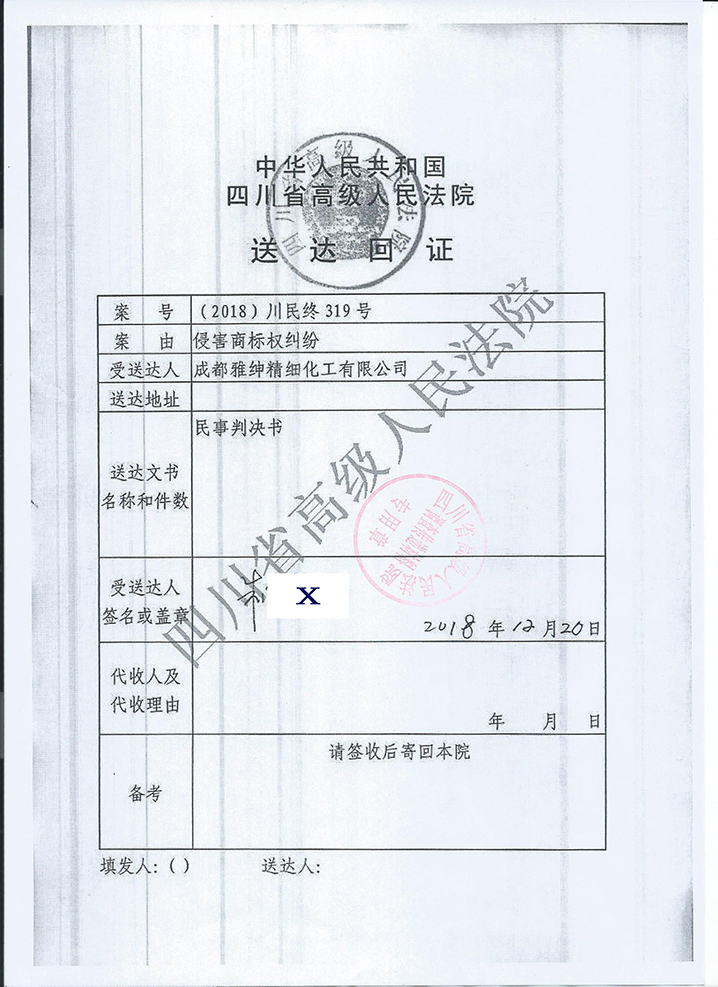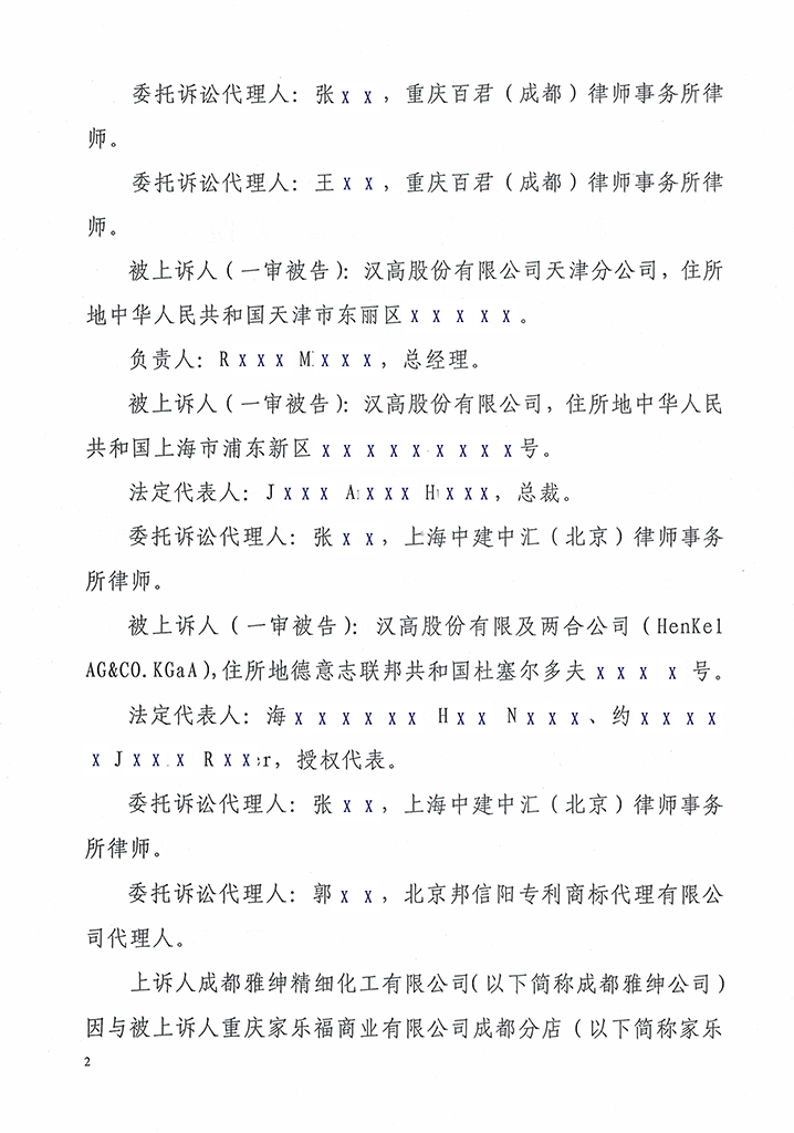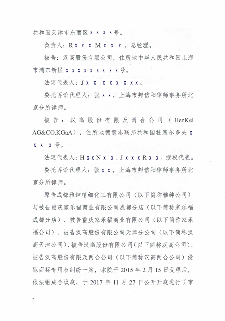 2018年9月28日 四川省高级人民法院《民事判决书》(2018)川民终319号成都雅绅公司诉德国汉高股份有限公司及两合公司(HenKeL AG & CO.KGaA)等商标侵权案件维权败诉。