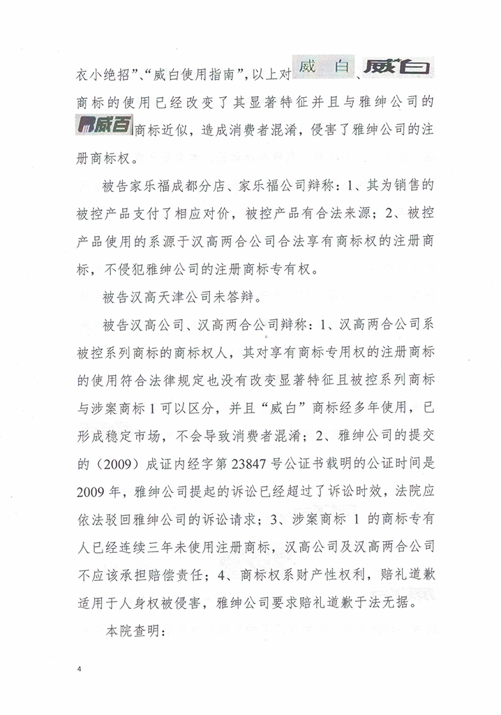 2004年8月23日、9月20日国家商标评审委员会作出《关于第73308号“威白”商标争议裁决书》商评字[2004]第5130号;《关于第996566号“威白”商标争议裁决书》商评字[2004]第4347号。成都雅绅公司再次获得商标评审委员会对“威白”、“威百”商标为近似商标的认定。