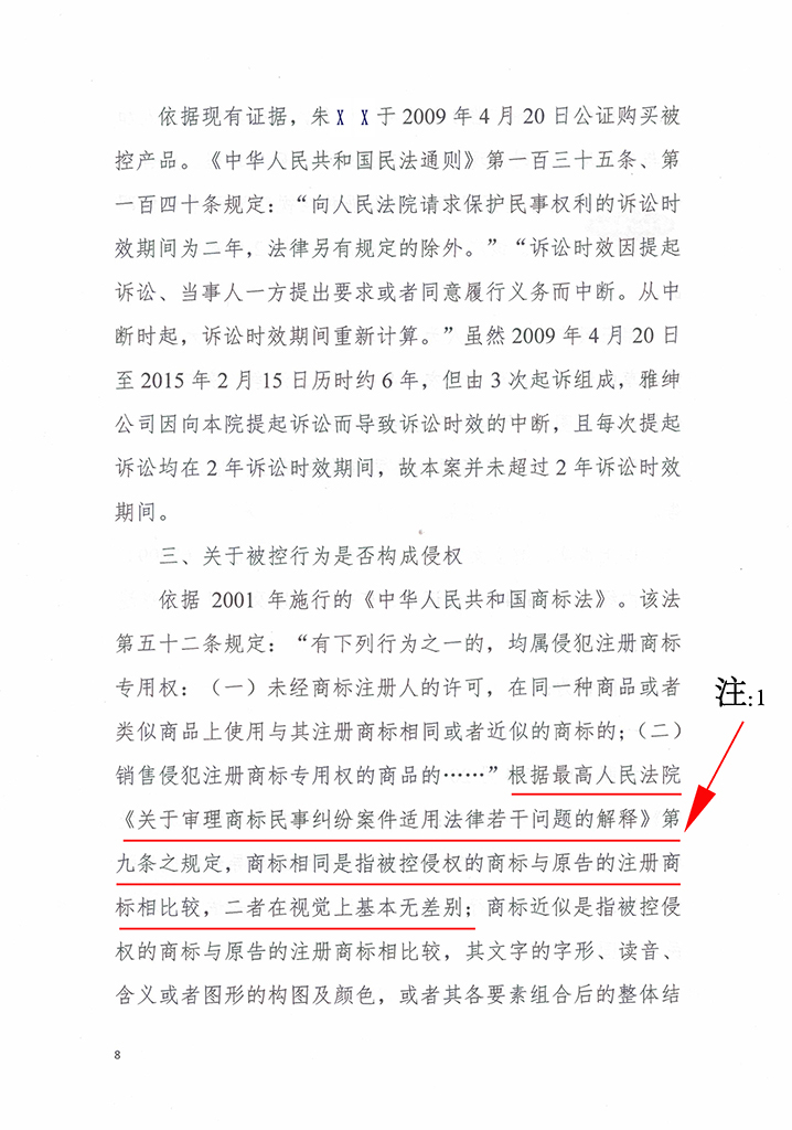 2、按照该判决书的这条司法解释,也应该理解为是指被告的被控侵权的商标与原告的注册商标相比较,二者在视觉上基本无差别,即——认定被告的被控侵权的商标与原告的注册商标相同。