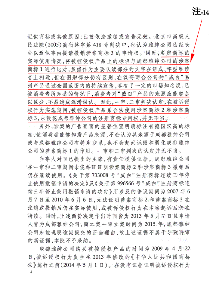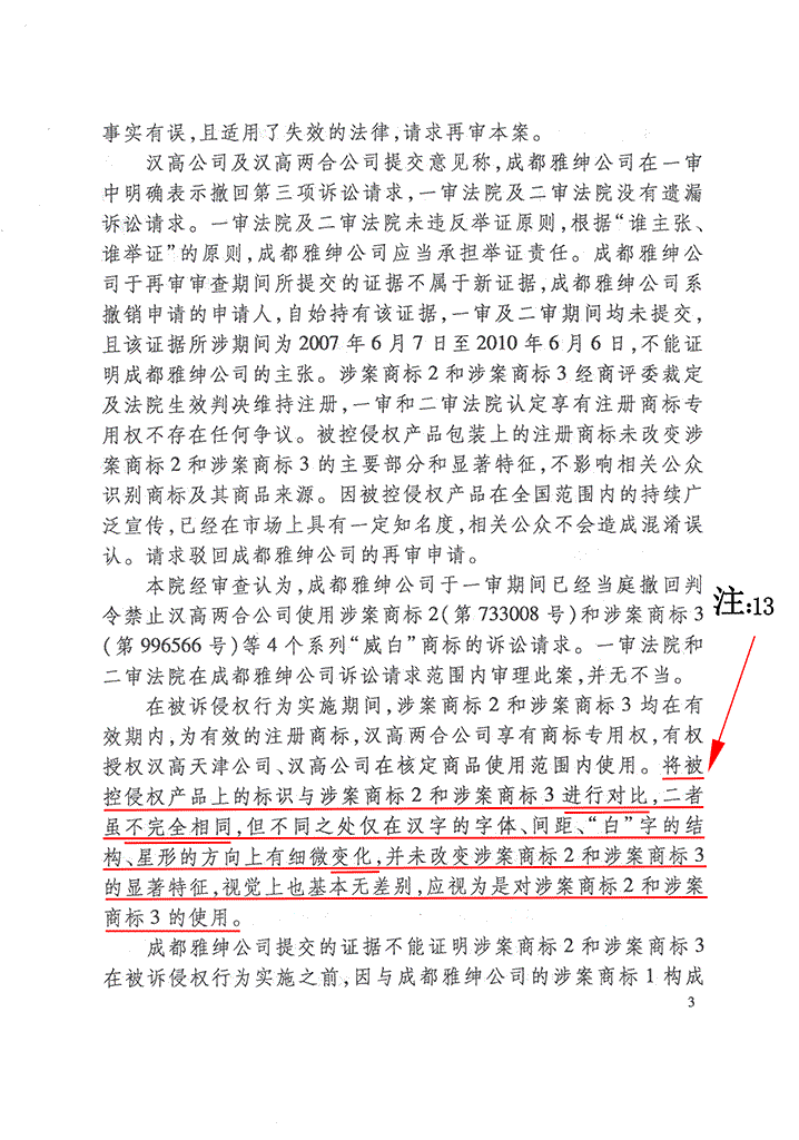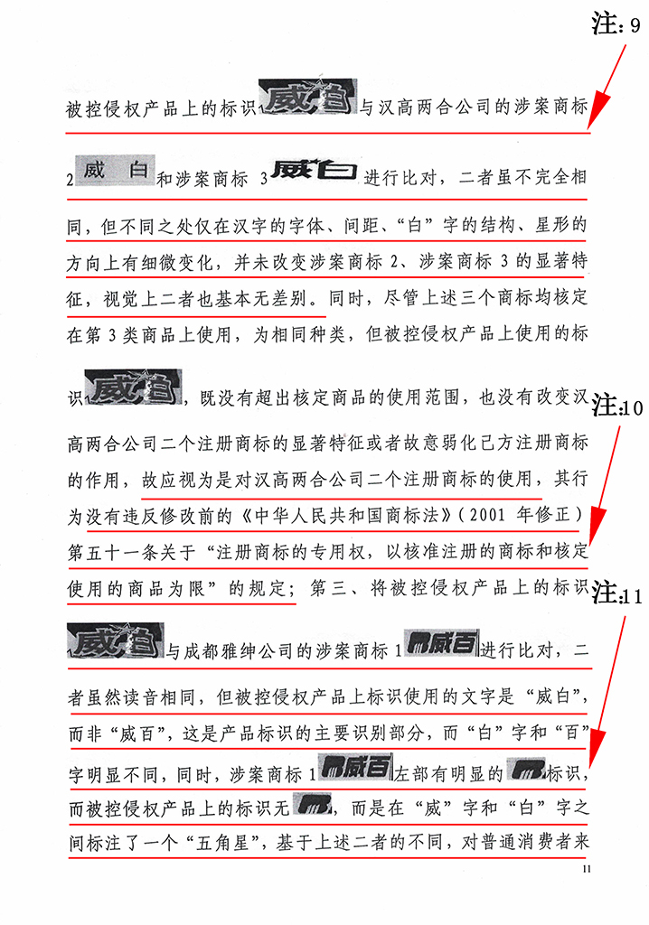 此处的判决认定,其目的就是要认定“威白”、“威百”商标不构成近似商标,不会给消费者造成混淆误认。首先,这个认定是违背事实的,一审原告《民事起诉状》证据:4、10、12、16、25、26、27、28、29、30大量证据证明是近似商标已经造成混淆误认。同时,认定“威白”、“威百”商标是近似商标,易造成混淆误认的认定证据是国家行政机关、司法机关作出的认定。本案此处在民事诉讼案中的不构成近似商标的认定,首先是违背事实的。其次,本案不是商标确权的行政诉讼案件。其认定的法律程序是否合法值得商榷。再其次,本案审判长有推翻上级国家行政机关、司法机关作出的认定结论的权力吗?同时,根据《最高人民法院关于审理商标民事纠纷案件适用法律若干问题的解释》法释〔2002〕32号针对《商标法》第五十二条 有下列行为之一的,均属侵犯注册商标专用权:(一)未经商标注册人的许可,在同一种商品或者类似商品上使用与其注册商标相同或者近似的商标的;的司法解释第九条……商标法第五十二条第(一)项规定的商标近似,是指被控侵权的商标与原告的注册商标相比较,其文字的字形、读音、含义或者图形的构图及颜色,或者其各要素组合后的整体结构相似,或者其立体形状、颜色组合近似,易使相关公众对商品的来源产生误认或者认为其来源与原告注册商标的商品有特定的联系。的规定,被告的被控侵权产品的
