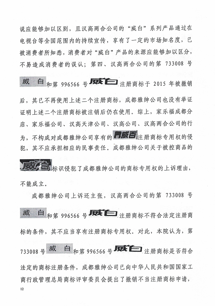 商标评审委员会对“撤销注册不当商标”案件作出“商标争议裁定书”成都民营企业向人民法院提起了行政诉讼。一、二审判决书(略)此时,“威白”、“威百”商标是近似商标,再一次得到了北京市高级人民法院的认定。见下图: