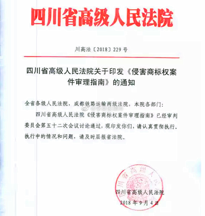 在本案之前,四川省高级人民法院印发《侵害商标权案件审理指南》【川高法〔2018〕229号】,本案审判长是否参与了审判委员会第五十二次会议讨论,我们不知道。但,本案审判长对《侵害商标权案件审理指南》是应当知道的,该《侵害商标权案件审理指南》