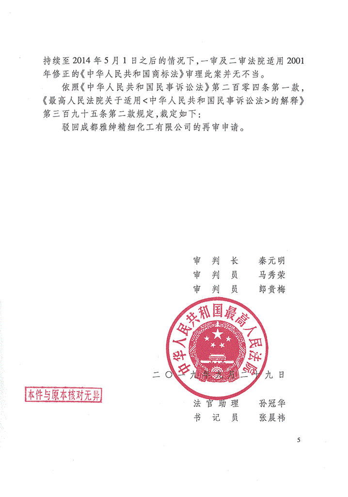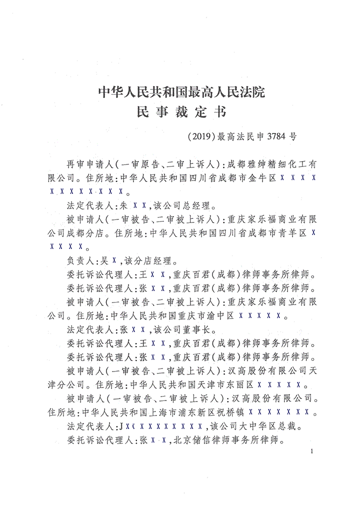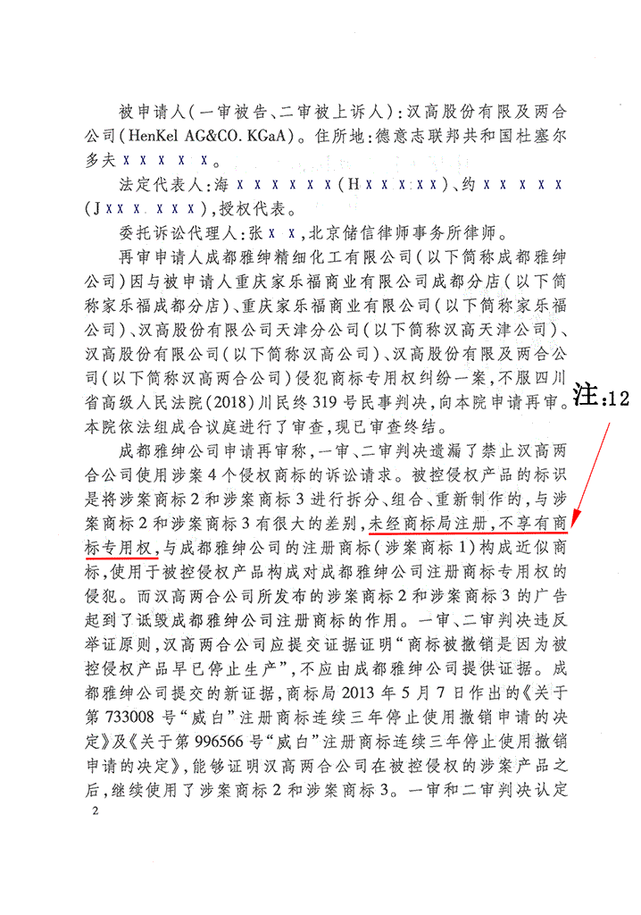 2019年9月29日 中华人民共和国最高人民法院《民事裁定书》(2019)最高法民申3784号成都雅绅公司诉汉高股份有限公司及两合公司(HenKeL AG & CO.KGaA)等商标纠纷案件维权败诉。