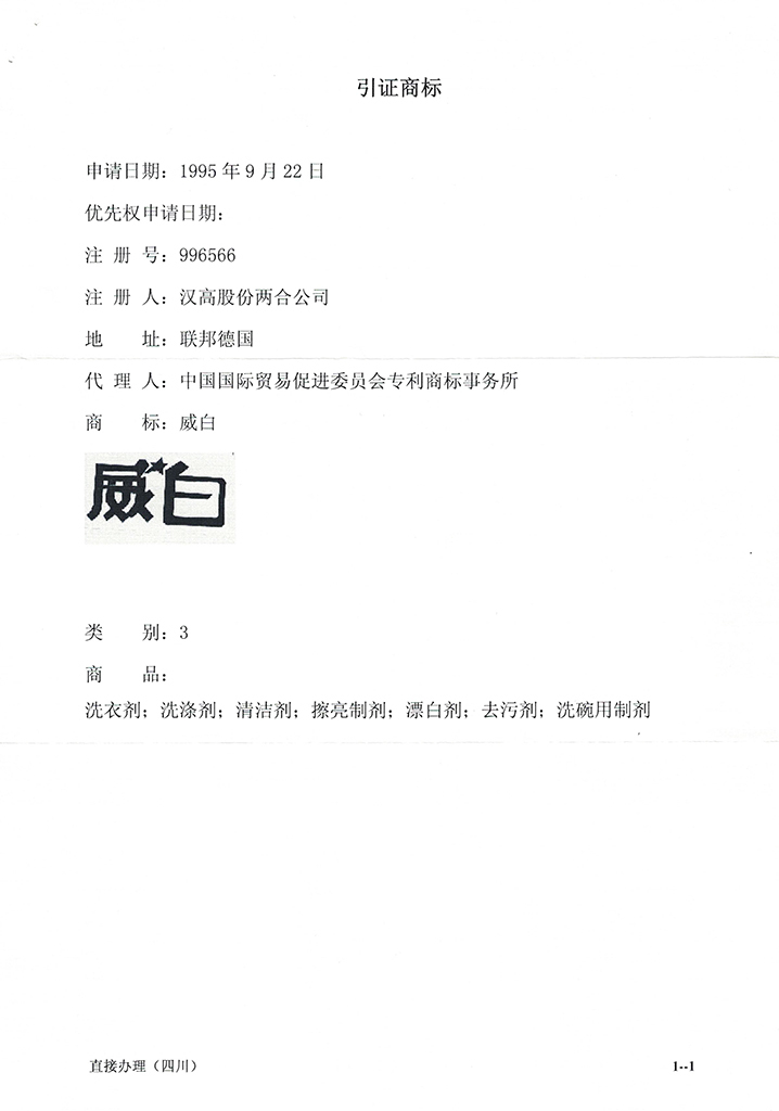 1997年5月7日德国汉高股份有限公司及两合公司(HenKeL AG & CO.KGaA)获得“威白”商标注册,《商标注册证》证书号:第996566号。